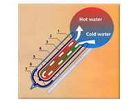 Como se observa en la figura, el agua caliente (Hot water) sube por el tubo y se introduce en el tanque y el agua fría (Cold water) baja a reemplazarla y calentarse. Este principio llamado termosifón hace que el equipo funcione solo sin necesidad de colocar mecanismos de bombeo, lo que hace más simple y confiable el sistema.