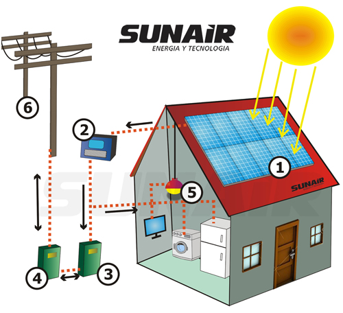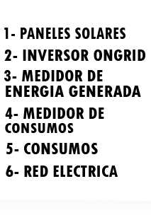 Durante las horas de sol los consumos son abastecidos por la energía generada por los paneles solares. Si esta energía no es suficiente, el faltante será abastecido por la red eléctrica.
